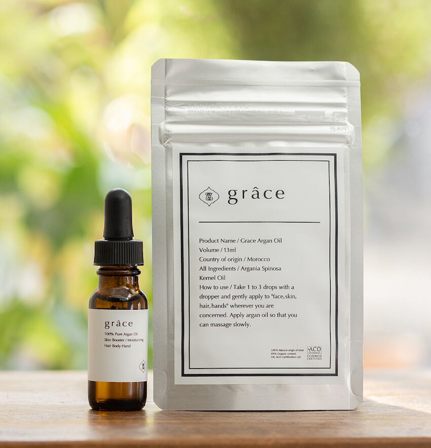 モロッコの黄金アルガンオイル。魔法のオイルとも言われるアルガンオイルは、肌に潤いを与える成分であるオレイン酸が豊富です。グラースはオーガニックにもこだわり全身に使える最高級のオイルです。