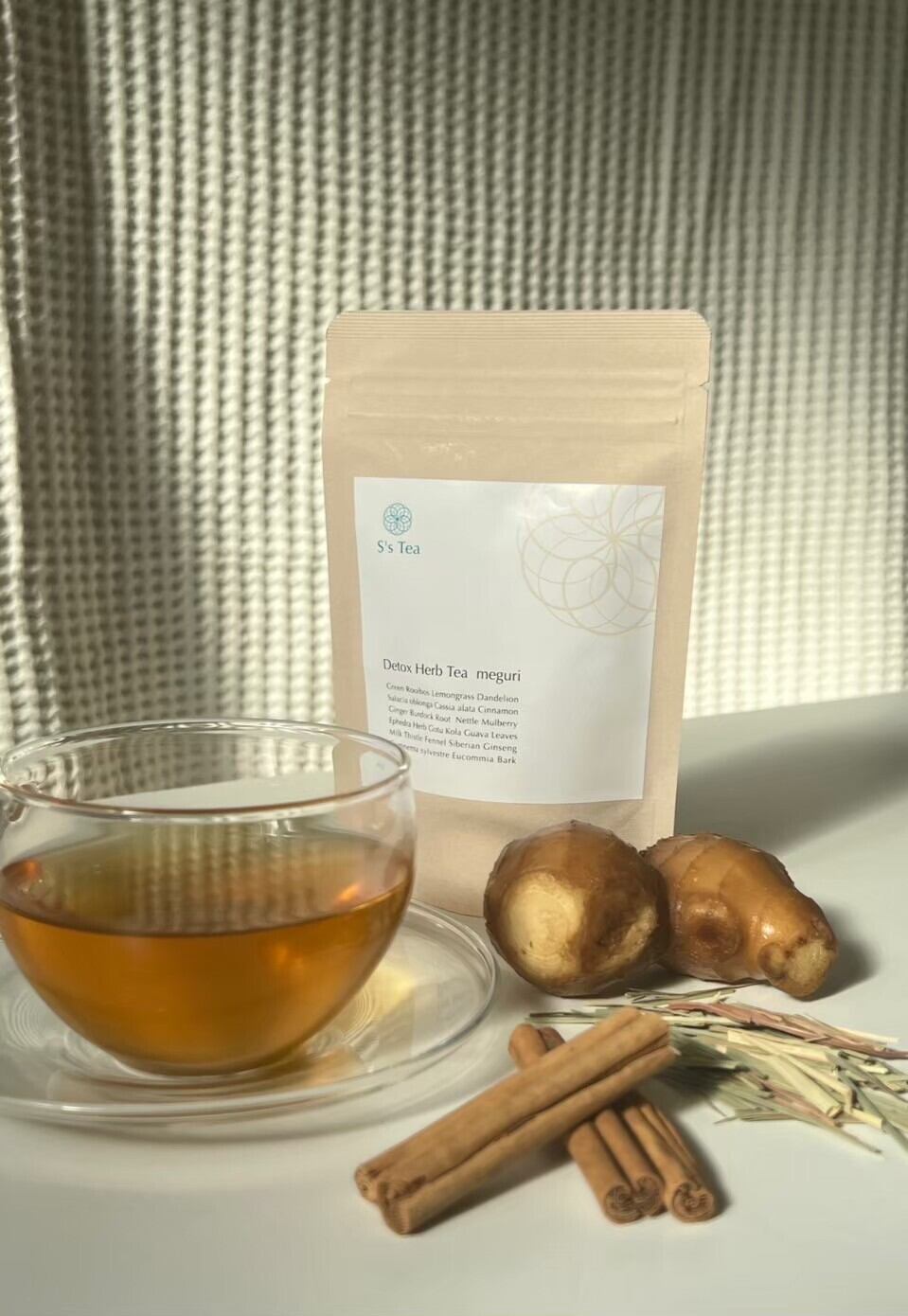 《原材料》 ・グリーンルイボス ・レモングラス ・ダンデリオン ・サラシアオブロンガ ・キャンドルブッシュ ・シナモン ・ジンジャー・ヒハツ ・ミルクシスル ・フェンネル ・マルベリー ・グァバ葉 ・シベリアンジンセン ・ギムネマアシルベスタ ・杜仲葉・オリーブ ・バードックルート ・ネトル ・ゴッコーラ